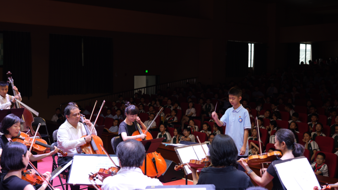 演出期间,在音乐的海洋中,乐队指挥老师用诙谐幽默的方式,将音乐会观演礼仪介绍给同学们,并以通俗易懂的语言介绍交响乐团各个乐器组代表乐器的音色特征,别出心裁的互动环节更是成为音乐会亮点。来自初一的杜同学也亲身体验了指挥的乐趣,这种寓教于乐的方式,使全场瞬间化作欢乐的互动课堂。
