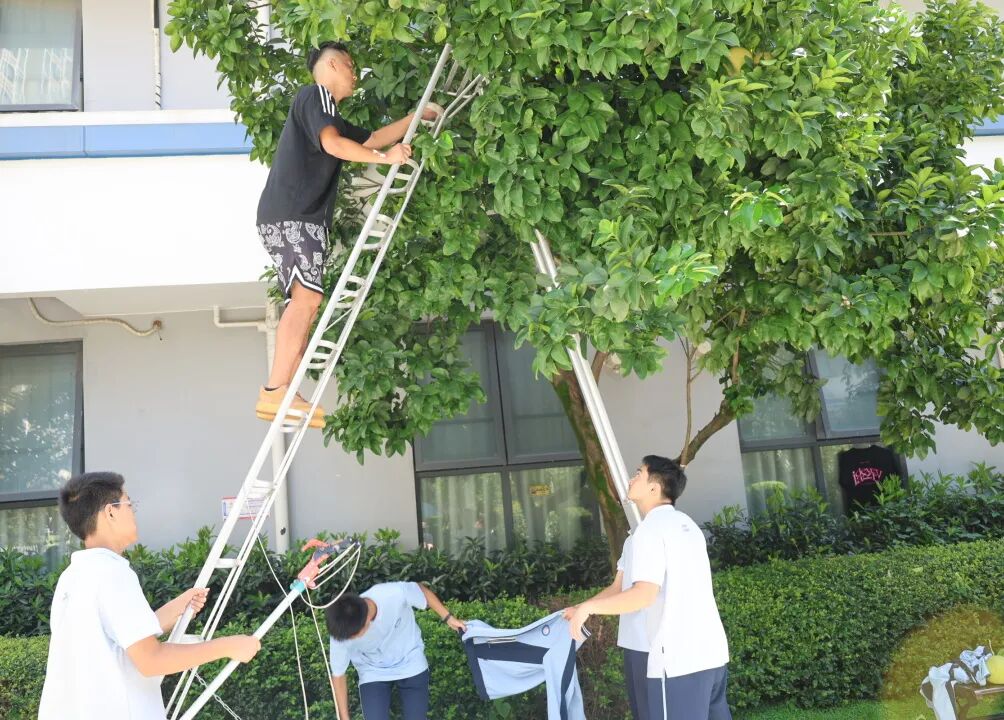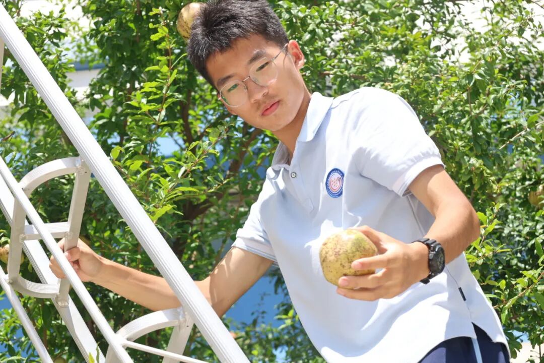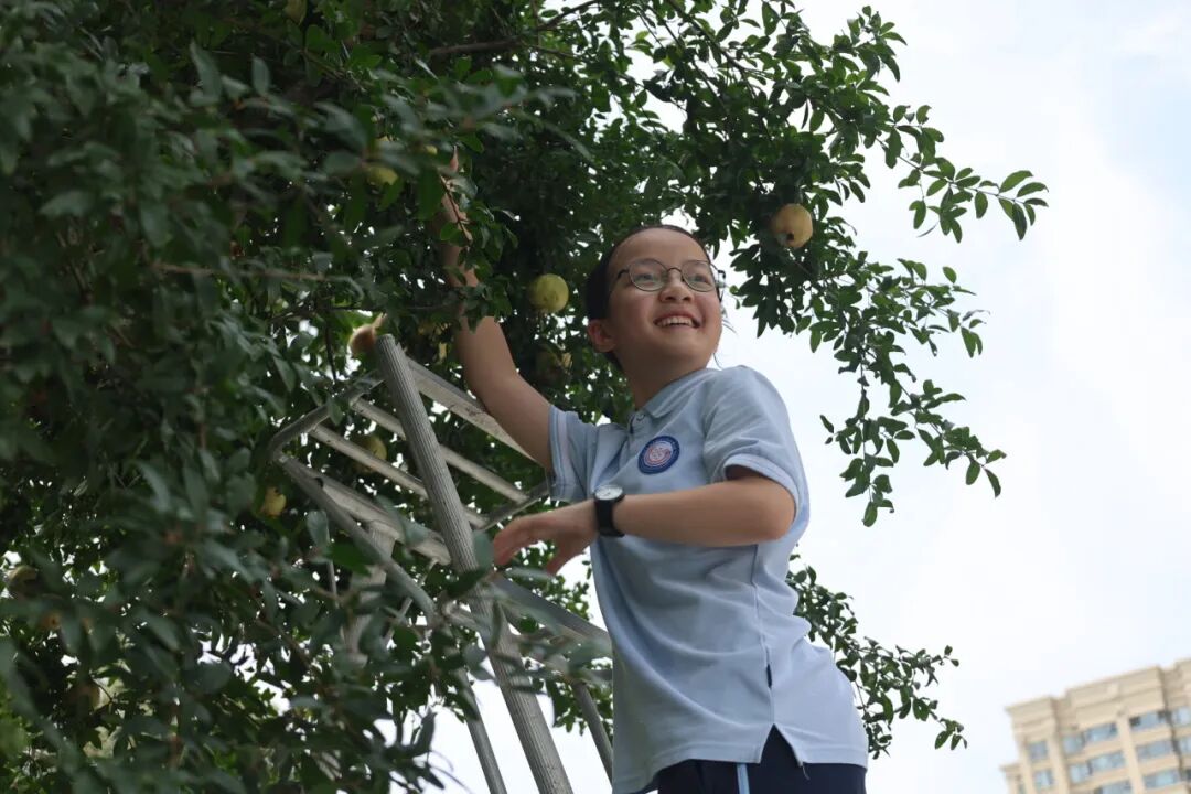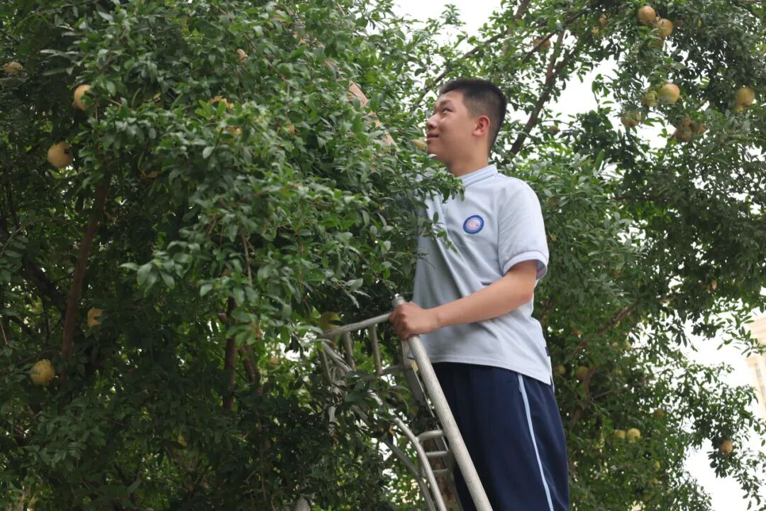 阳光透过枝叶洒下斑驳光影,同学们分组来到果树下。 在老师的悉心指导下,同学们或灵巧地攀上梯子,寻觅最佳的摘取角度;或牵起衣服期待着果实的“降临”;或垫起脚传接着果实。随着一个个果实被摘下,欢声笑语回荡在校园的每个角落,收获与喜悦构成秋日最美的风景线。
