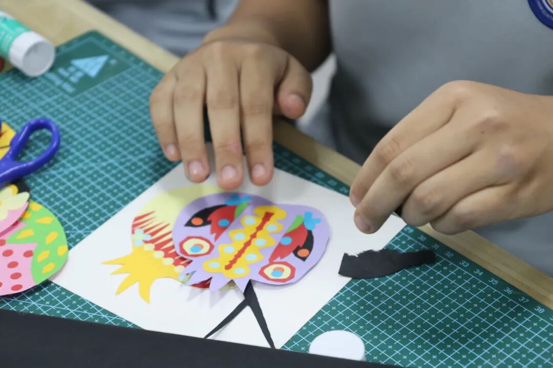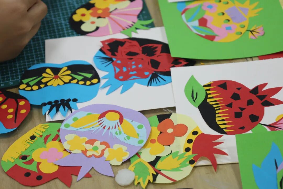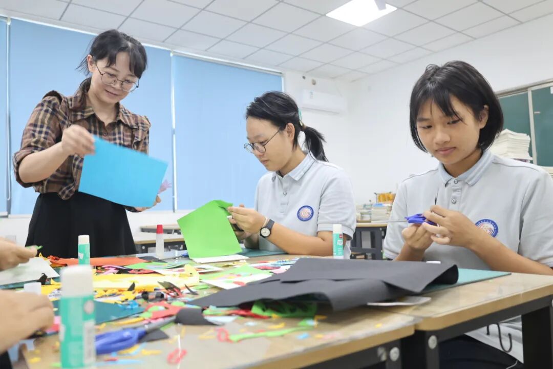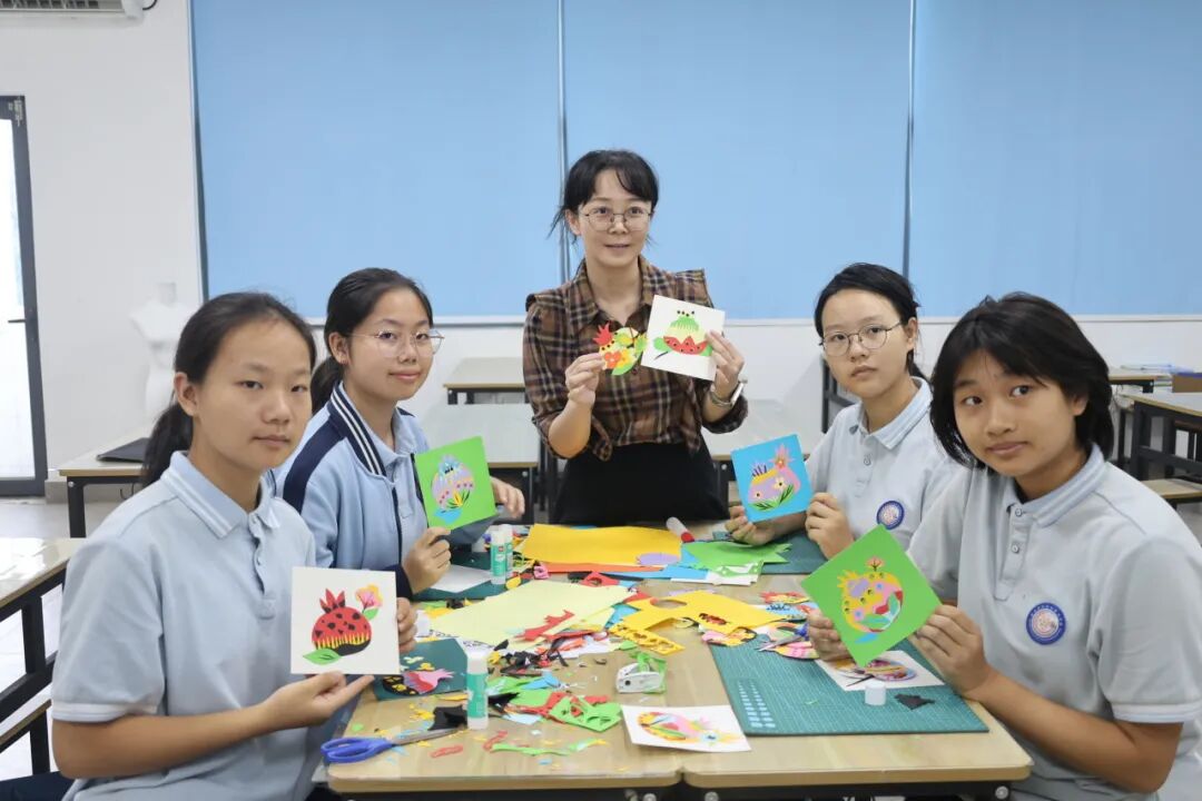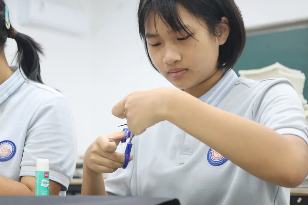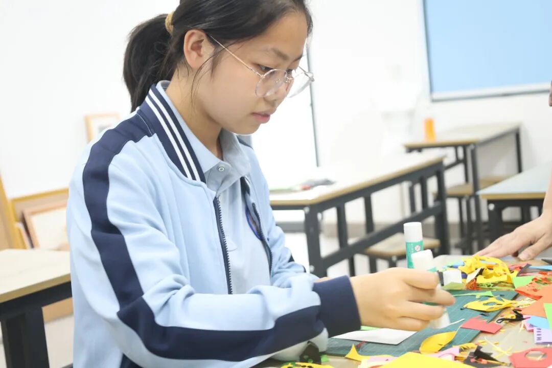 采摘结束后,同学们分组开始了丰富多彩的创作活动。美术教室里,同学们在刘婷婷老师的指导下用剪纸和拼贴的方式描绘石榴的嫣红;未来教室里,同学们跟着曹旭老师一起学习制作柚子茶。