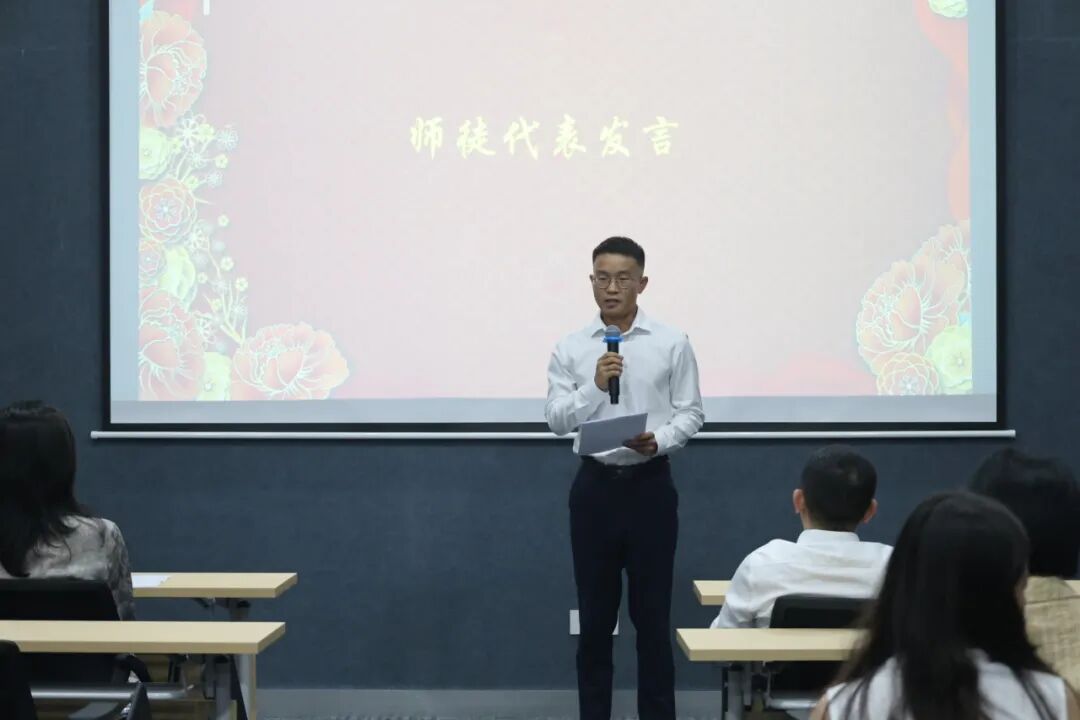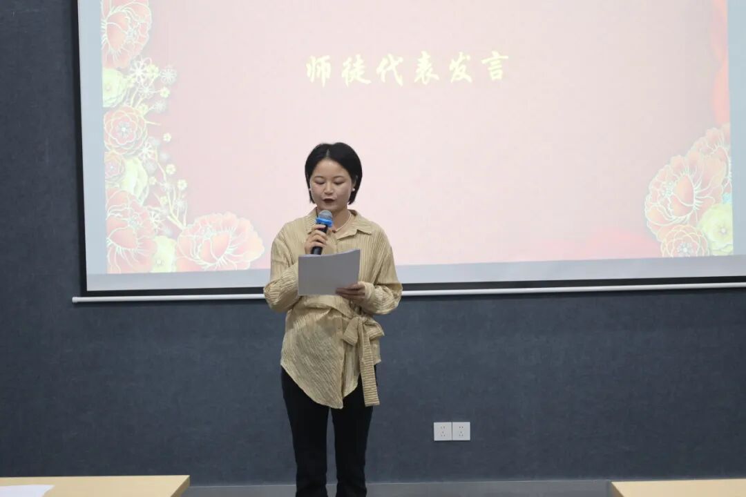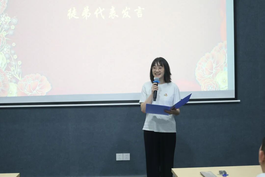 随后,徒弟代表周玢宇发言,分享了在师傅指导下的成长经历,言语中充满感恩与敬意,并表达了继续精进教学、不负期望的决心。