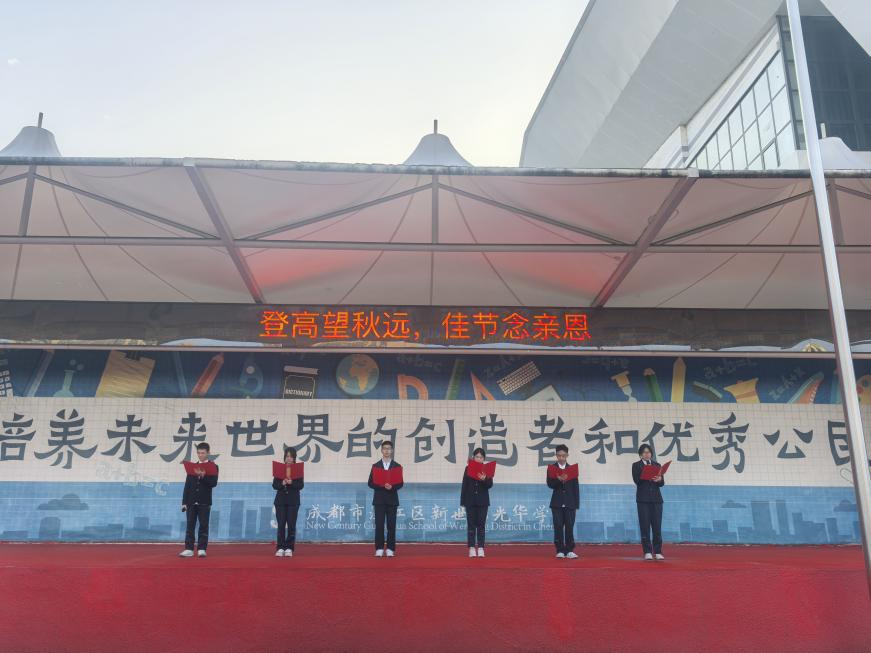 周一的升旗仪式上,“登高望秋远,佳节念亲恩”主题朗诵在校园中回荡。同学们以真挚的语调、饱满的情感,表达对长辈的深深敬意与感恩,在庄重的仪式中传递孝亲尊老的文化力量。