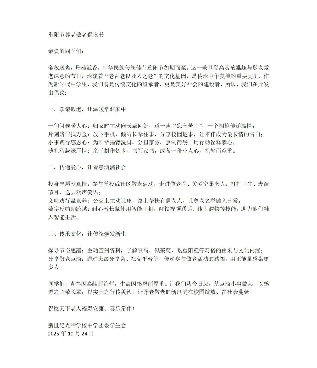 校团委学生会同步发起尊老敬老倡议书,号召全体同学积极传承中华优秀传统文化,从身边做起,以实际行动践行孝亲初心,让尊老敬老在校园蔚然成风。