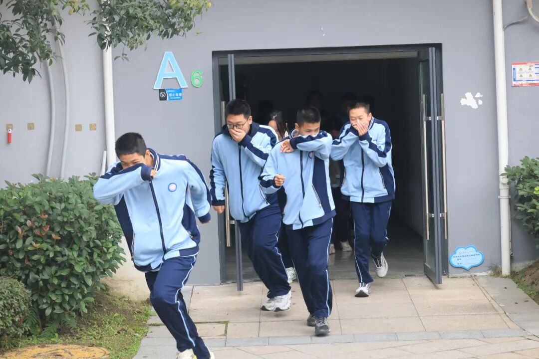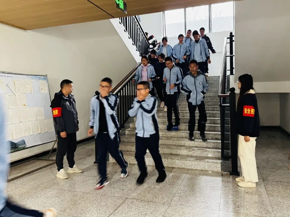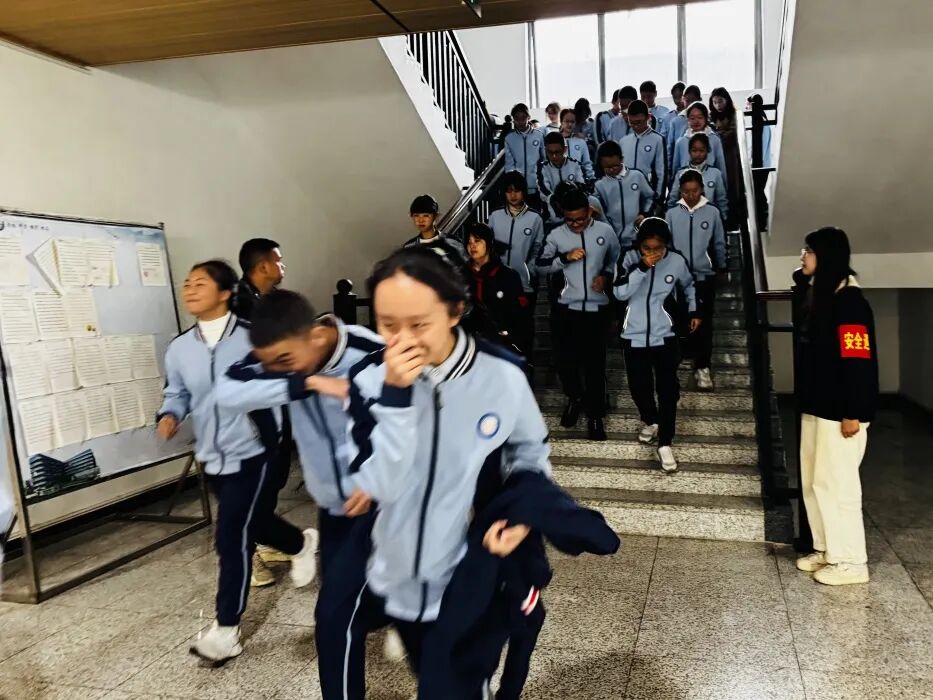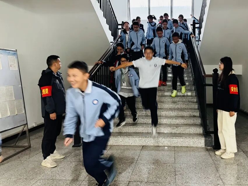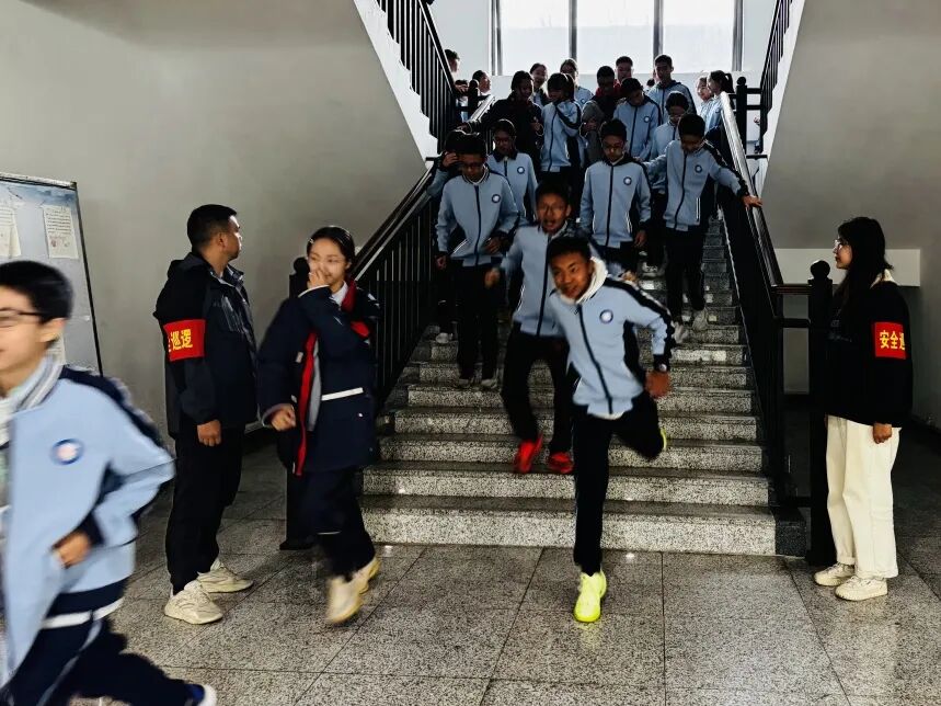 在消防应急疏散演练环节中,全体初一住校生在生活老师与寝室长的指引下,迅速进入应急状态,沿着预定疏散路线快速、有序地向安全区域撤离。整个过程组织严密、反应迅速,展现了师生良好的应急素养。