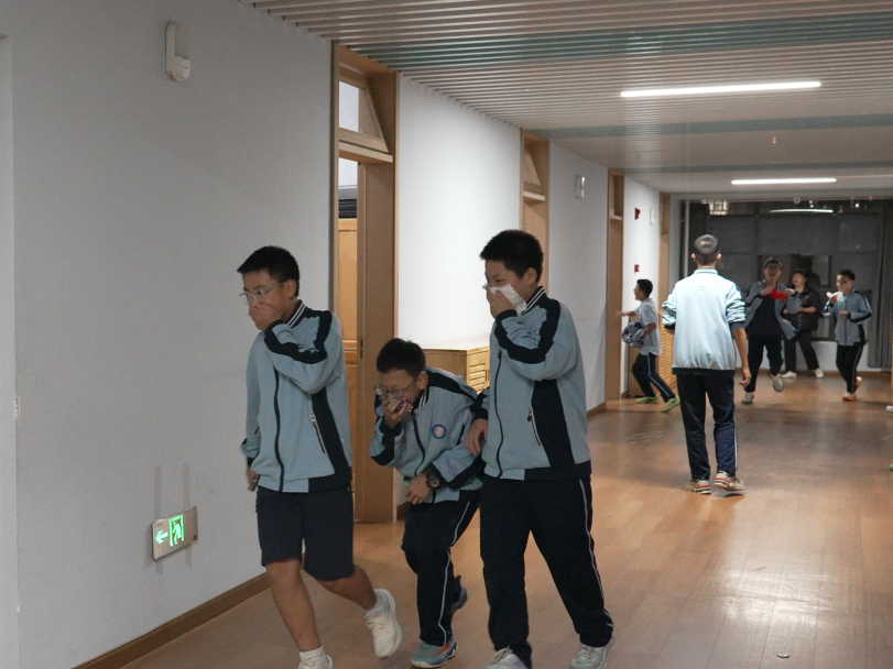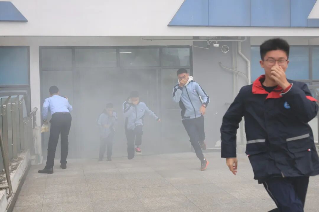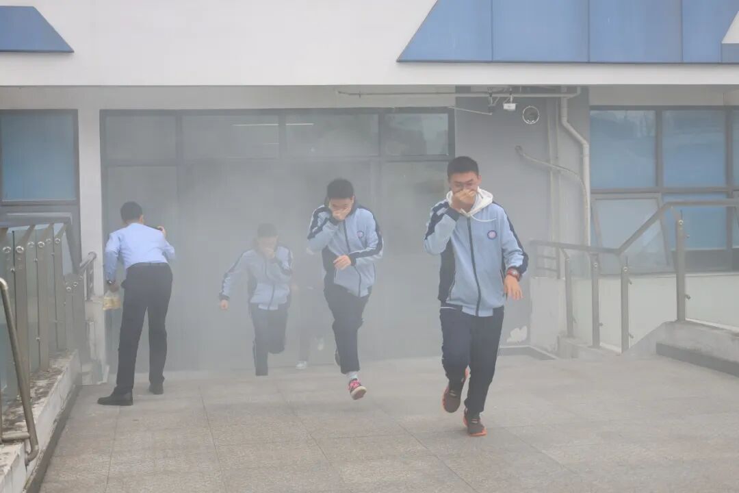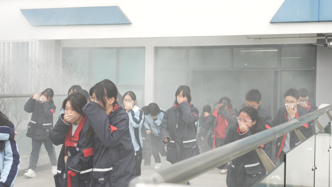 演练正式开始,温江区利民消防的教官也到校指导。随着烟饼点燃,模拟浓烟缓缓弥漫,全体学生在老师的指引下迅速反应、有序疏散,全部安全抵达操场集合。