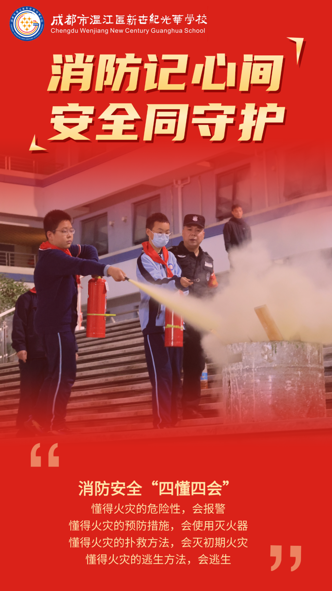 让我们从熄灭一个烟头、拔掉一个插头做起,让安全成为一种习惯,让防范成为一种能力,共同守护我们美丽、安宁的校园家园!