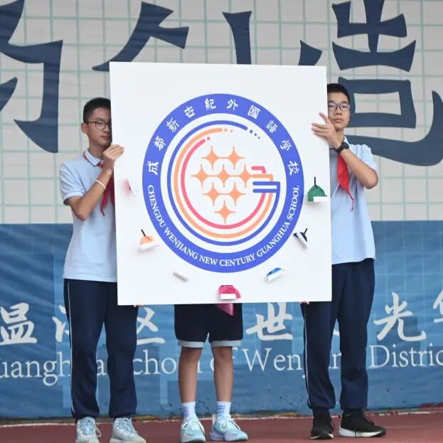 开学典礼的第二篇章,主持人向新同学、新老师介绍学校的校徽——校徽主体由“华”字的繁体演化而来,似硕果,寓意自强不息;外围三条线条来自于“光”字的大写首字母“G”,三色代表学校的真实、幸福、卓越文化三原色,在新学年邓校长将之幻化成美丽的七彩虹,彩虹寓意着美好和幸运,也意味着风雨。