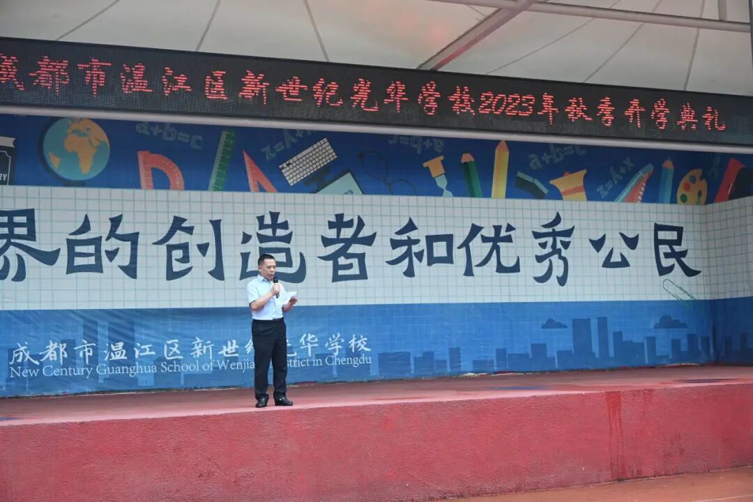 接着,邓文光校长为新学期致辞。邓校长首先对刚入学的新同学、刚入职的新老师表示热烈的欢迎!他深情回顾了过去一年中,新世纪人团结奋斗、踔厉奋发的日子,鼓励每一位新世纪人接续奋斗,乐于拼搏。同时他也强调在这个快速变化的世界中,我们需要不断学习,掌握新知,用知识之光照亮我们的未来。