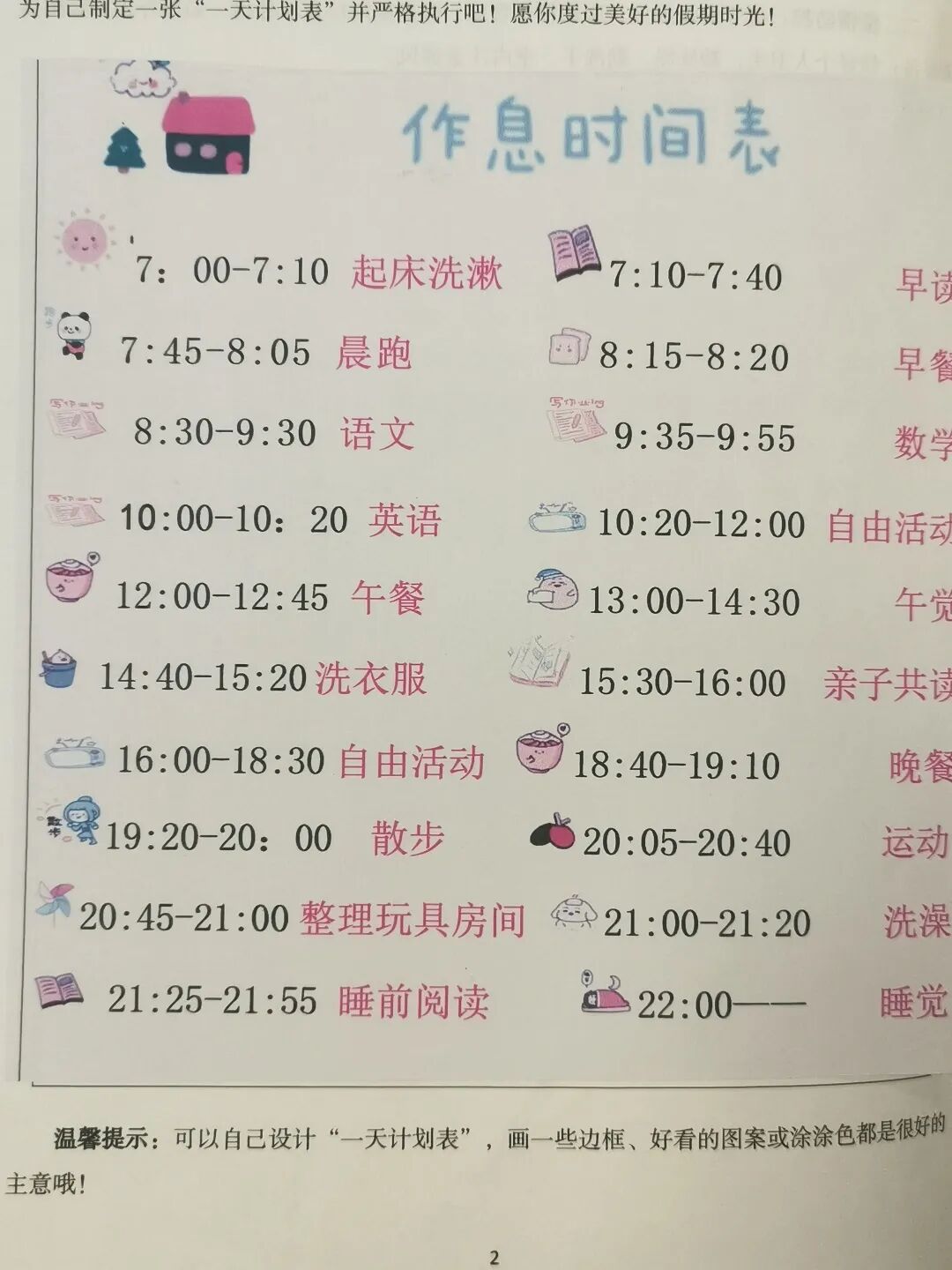 立志言为本,修身行乃先。放假前,老师为孩子们精心设计了行为标准指导,分别从传播文明、安全自护、按时作息三大方面督促孩子自我评价。孩子们自主制定作息时间表,养成做事有计划、有条理的好习惯,同时,用“行为记录表”记录自己的行为表现,争当自律小模范!
