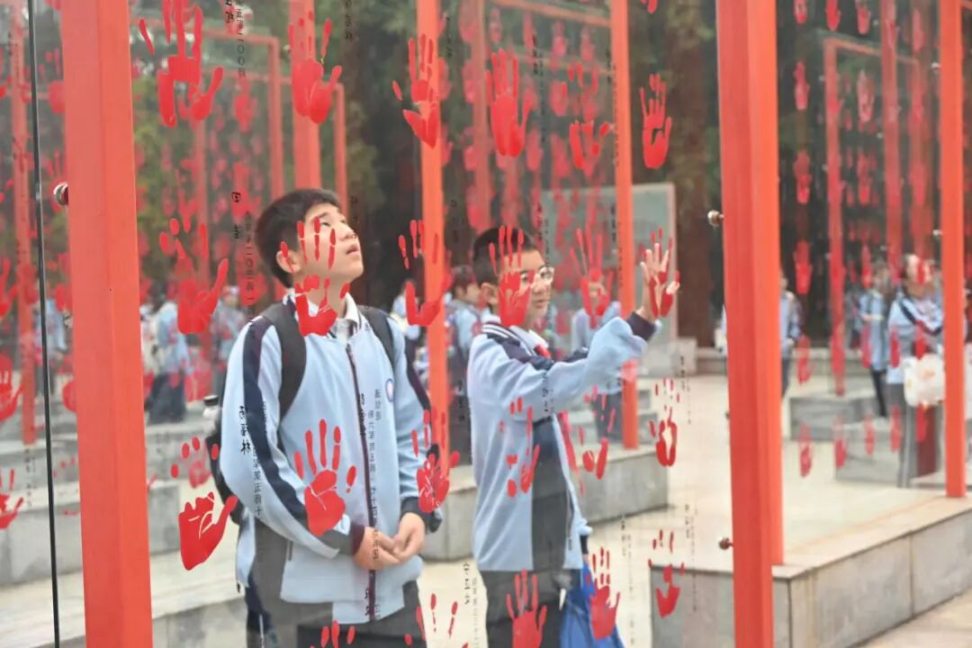 在抗战老兵手印碑林,同学们将自己的手掌与手印重合。正是这些投掷手榴弹、埋地雷、炸碉堡的手,捍卫了祖国,拯救了同胞。在十指相印间,青少年承载起民族的未来与光明的希望。