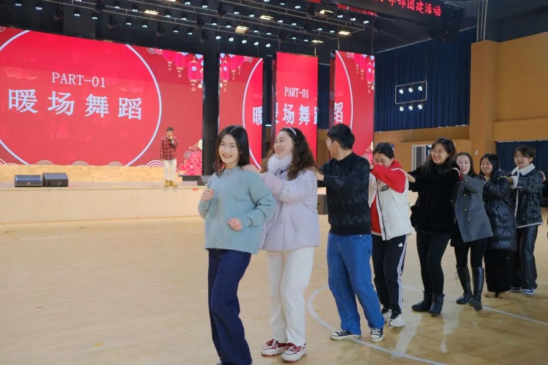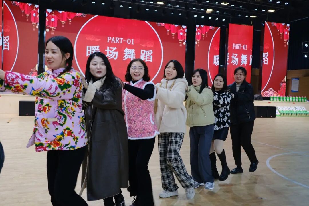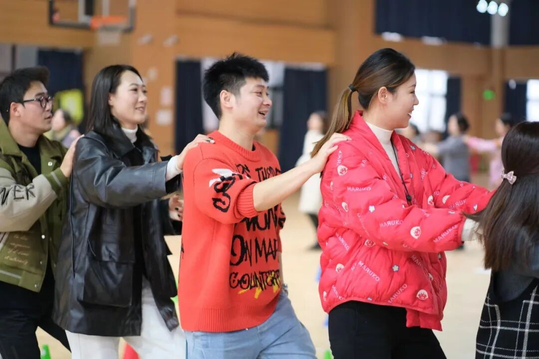 暖场舞拉开了活动的序幕。在音乐梁老师的组织下,魏校长和小学部的老师们肩搭肩围成了一个圆形,愉悦的笑声、逐渐协调的动作、伴着欢快的节奏,定格了一幅幅幸福美好的画面。