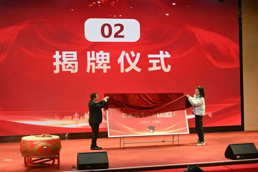 邓文光校长和家长代表王琴女士共同揭开100天倒计时牌。100天,是高三学子驰骋人生快跑道的鼓点。100天,是高三学子的人生辉煌新篇章的伊始。满怀鸿鹄之志的学子们,必将破除万难越千山。逆风而行,必将笑看春花烂漫,彩霞漫天。