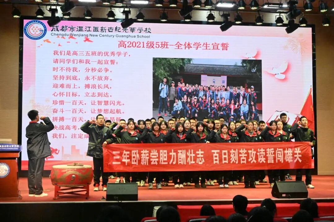 时序更迭,百日征程号角已吹响。十八而志,追梦的青春少年们即将迎来高中学习生涯中的最后的冲刺阶段。为进一步激发学生坚持不懈的学习状态,坚定学生奋力前行的学习信心,温江区新世纪光华学校于2024年2月28日举行“拼搏有我,使命必达”高2021级高考百日誓师活动。邓文光校长、杜毅副校长、魏燕副校长、李世建副校长,及高中部全体行政、高三全体教师以及各班家长代表出席本次活动。