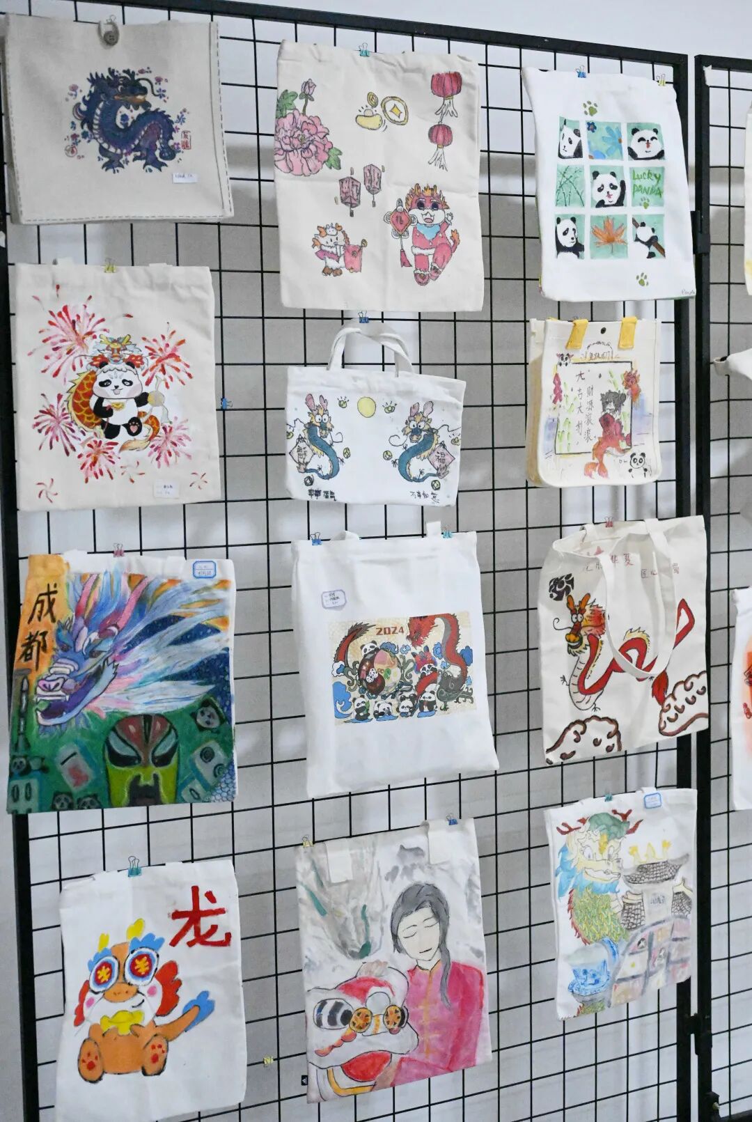 初三6班樊崇昊将传统文化与成都传统文化主题相结合,进行了龙文化帆布包的相关创作。独特的毛笔书绘,多样化的媒介材料,精湛的绘画技术,让他的创作与众不同。