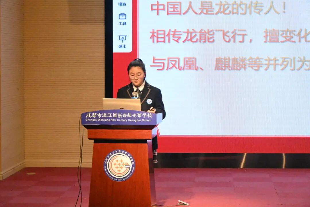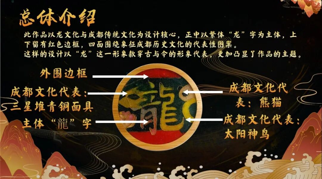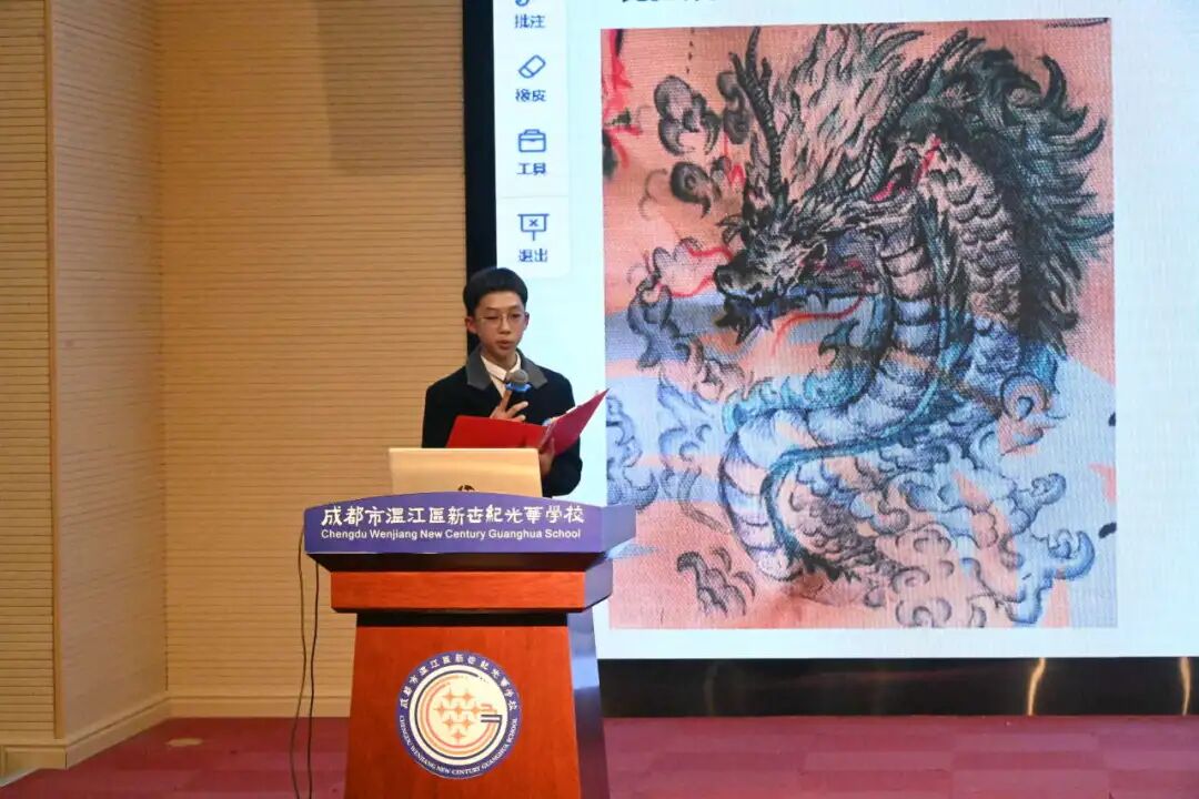 来自初二7班的制作压轴上场为大家展示他们的作品——龙行成都纪念地图,地图上有七条手绘的龙,它们分别是幸福龙、友谊龙、潜力龙、雅逸龙、蓬勃龙、人文龙与腾跃龙。我们将龙文化融入地图中,作为成都市各区域的印象关键词,展现出区域的特色与魅力。而各区县中的景点建筑,则是成都文化的见证者,也是创造者,更是成都记忆的守护者。我们希望通过这幅地图,向人们展现出成都城市的无尽热情,成都记忆的无尽澎湃,成都对人们“龙行龘龘”的无尽祝愿。