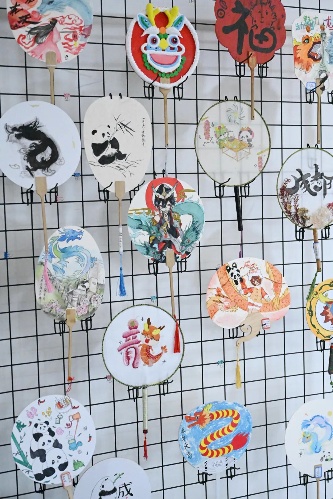 扇子的美在于有传统的技术、有实用的价值、更有美术的意蕴。来自初二10班同学的马文琪和查颖涵巧妙把龙、太阳神鸟、芙蓉花、熊猫和地铁等成都元素呈现在扇子上,再画上两朵祥云和南丝之路缠绕着龙,让成都文化顺着丝绸之路传播,意寓成都的昨天,今天和明天。